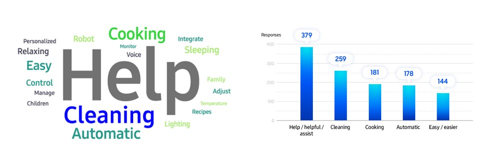 まず、「AIに家庭で果たしてほしい役割は何か?」という問いに対して、「助ける/手助け/支援」(379件)、「掃除」(259件)、「調理」(181件)、「自動化」(178件)、「簡単/より簡単に」(144件)といった回答が多く寄せられました。