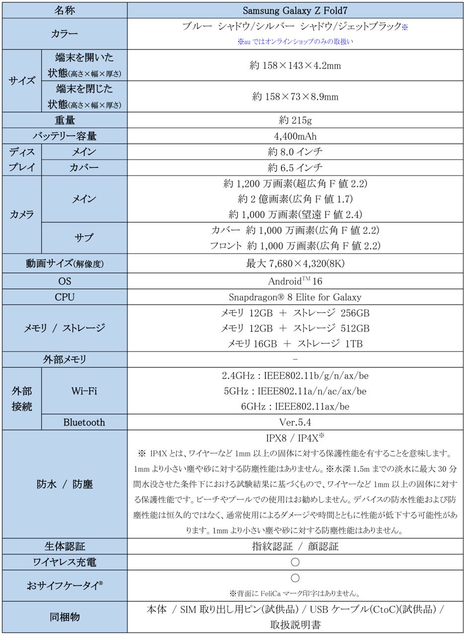 <主な仕様 : 「Samsung Galaxy Z Fold7」>