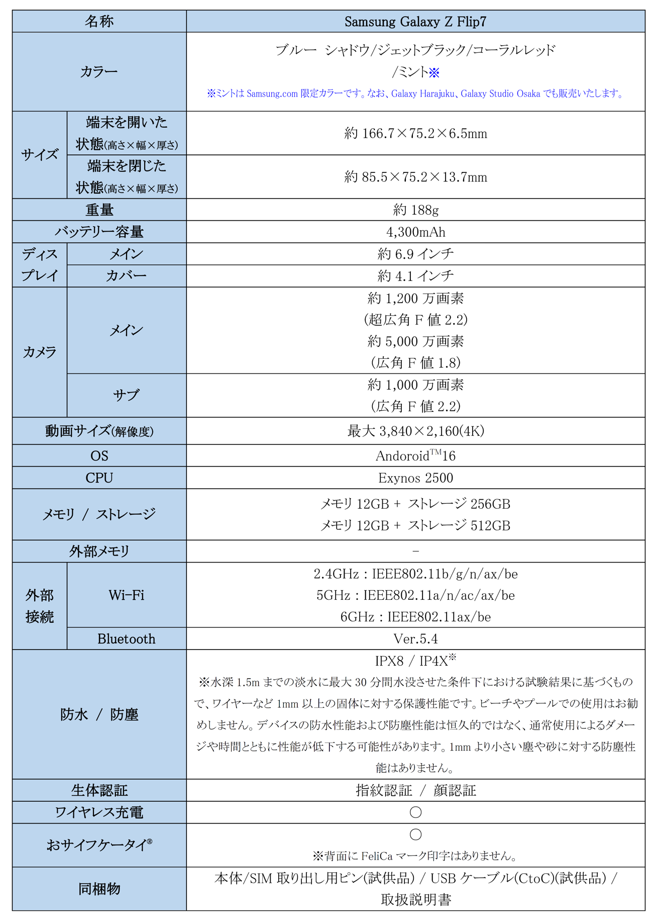 <主な仕様 :「Samsung Galaxy Z Flip7」(SIMフリーモデル)>