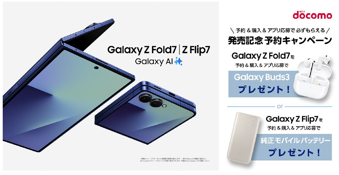 また、本日2025年7月17日(木)より全国のドコモショップ、ドコモ取扱店、ドコモオンラインショップ、 ahamoサイトにて「Samsung Galaxy Z Flip7発売記念 予約キャンペーン」※を開催いたします。