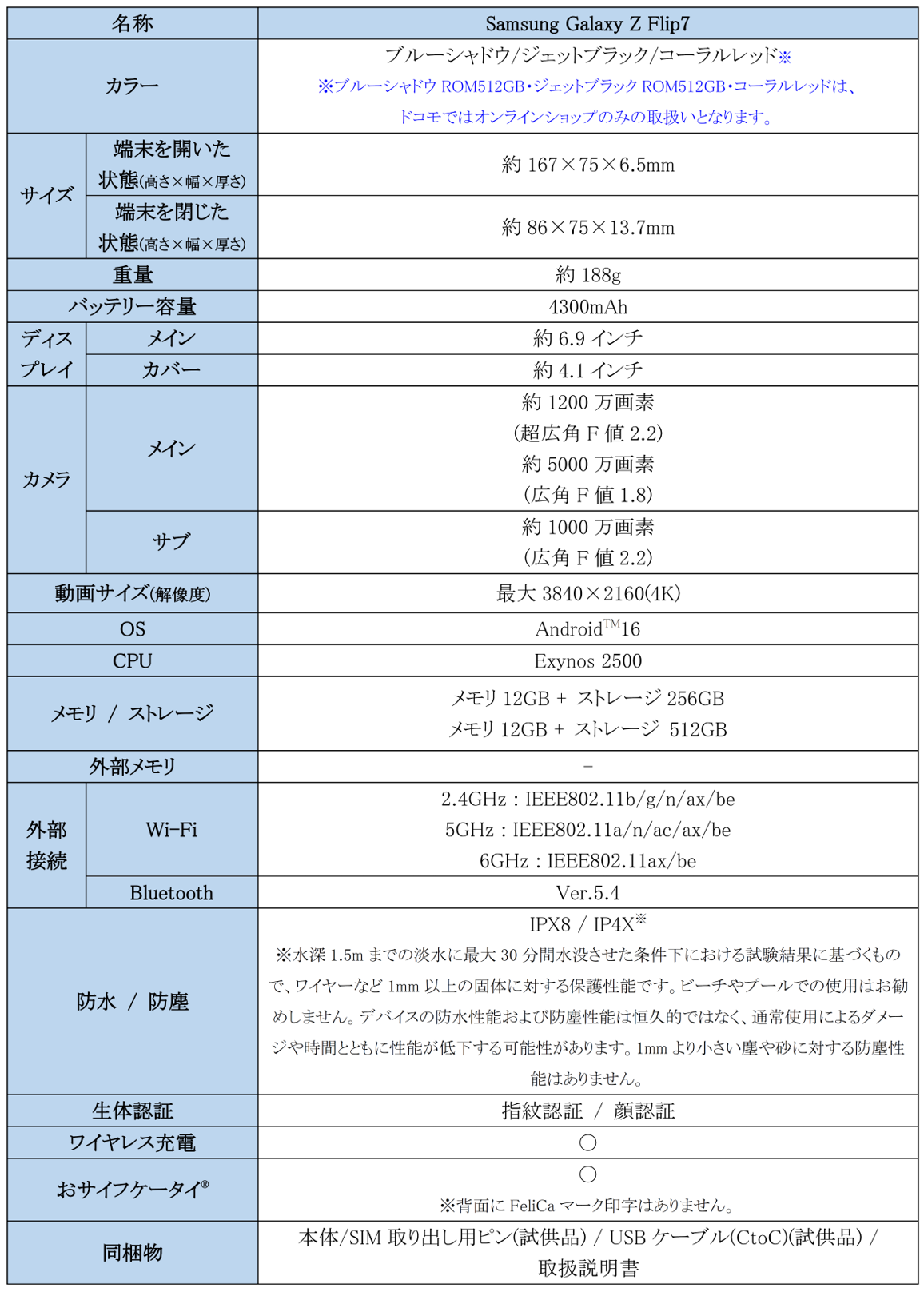 また、「Samsung Galaxy Z Flip7」の純正・専用アクセサリーは2025年8月1日(金)より販売を開始いたします。詳細はドコモオンラインショップ(https://onlineshop.smt.docomo.ne.jp/limited_options/article/930006.html?icid=OLS_limited_options_article_930006_from_option_search_bnr_slide)をご確認ください。