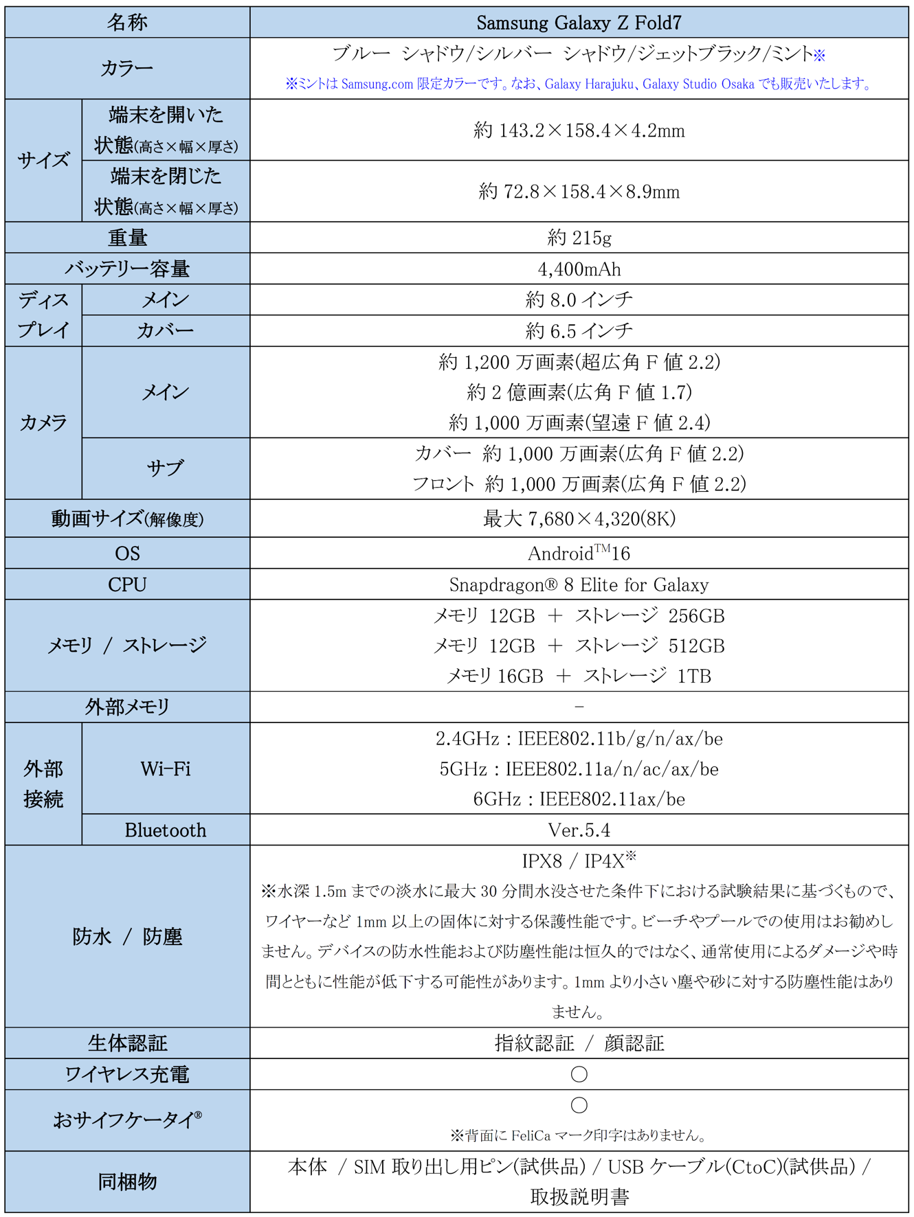 <主な仕様 : 「Samsung Galaxy Z Fold7」 (SIMフリーモデル)>