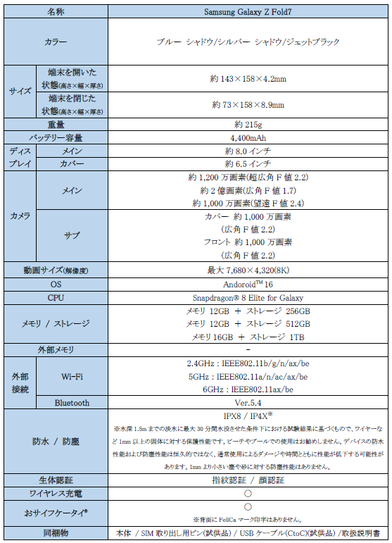 <主な仕様 : 「Samsung Galaxy Z Fold7」 (SIMフリーモデル)>