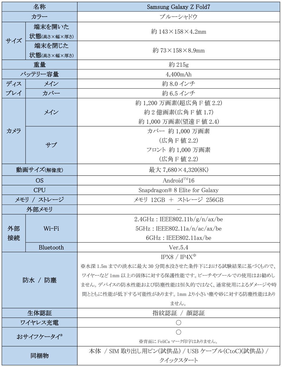 <主な仕様 : 「Samsung Galaxy Z Fold7」>