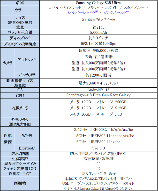 <主な仕様:「Samsung Galaxy S26 Ultra」>