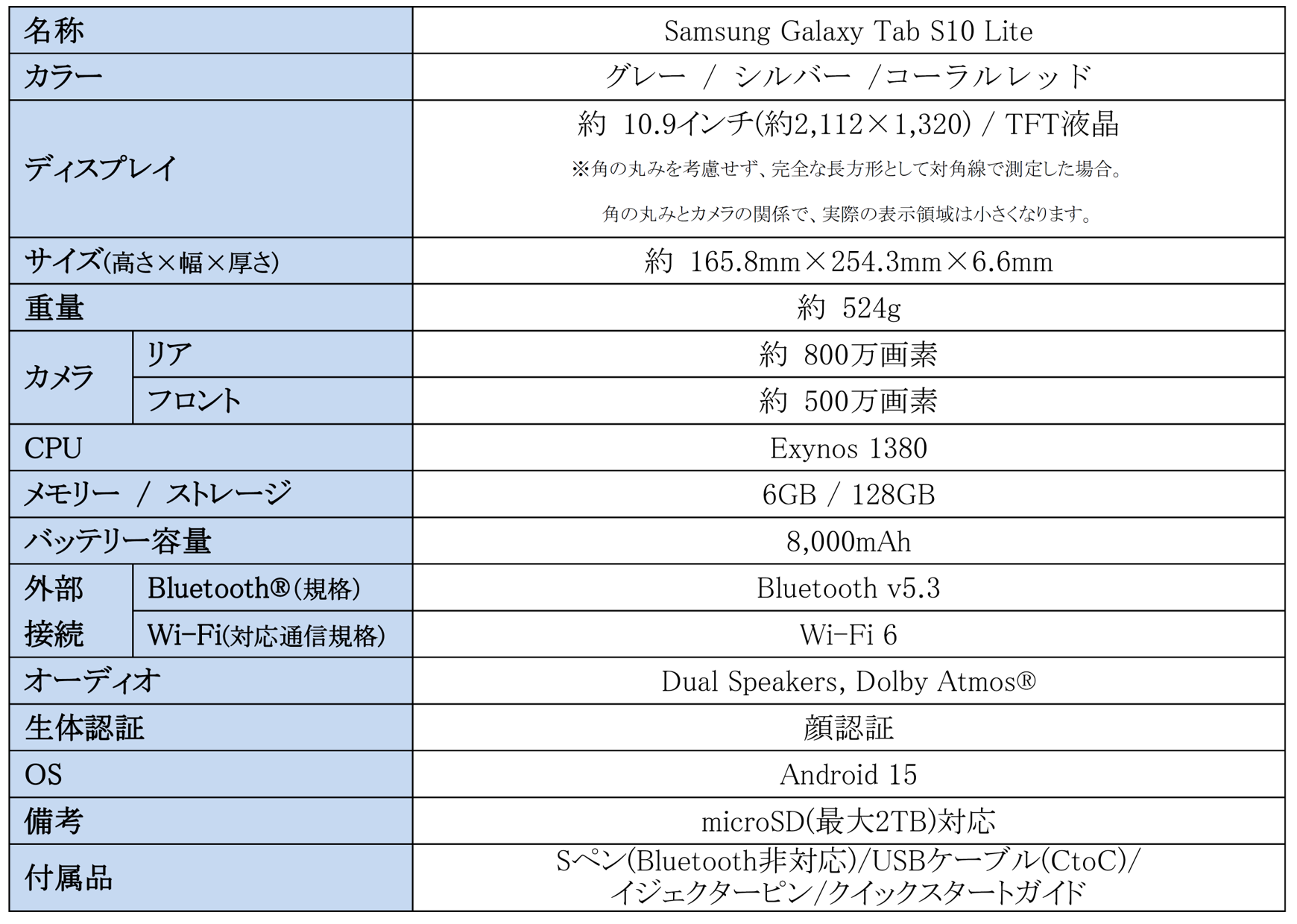 <主な仕様:「Samsung Galaxy Tab S10 Lite」>
