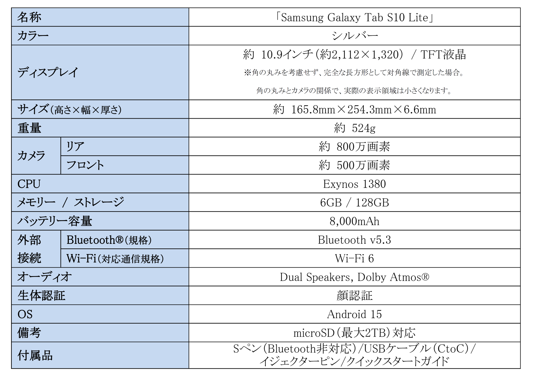 <主な仕様:「Samsung Galaxy Tab S10 Lite」>