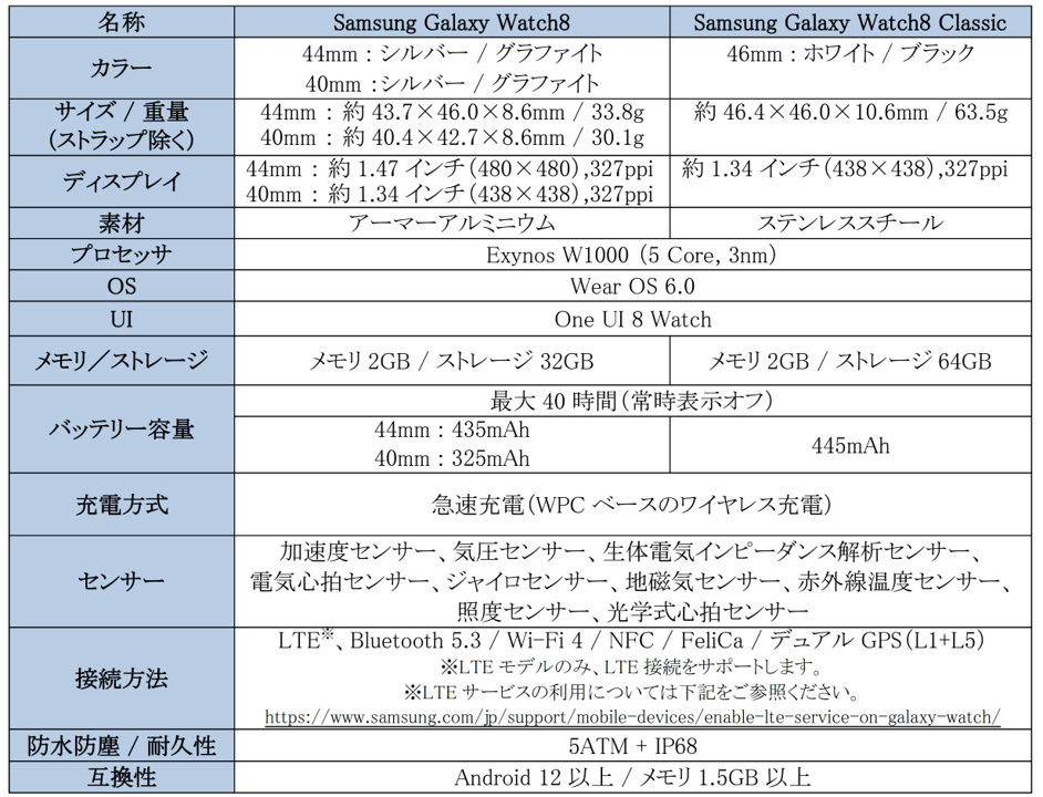 <主な仕様 :「Samsung Galaxy Watch8│Watch8 Classic」>