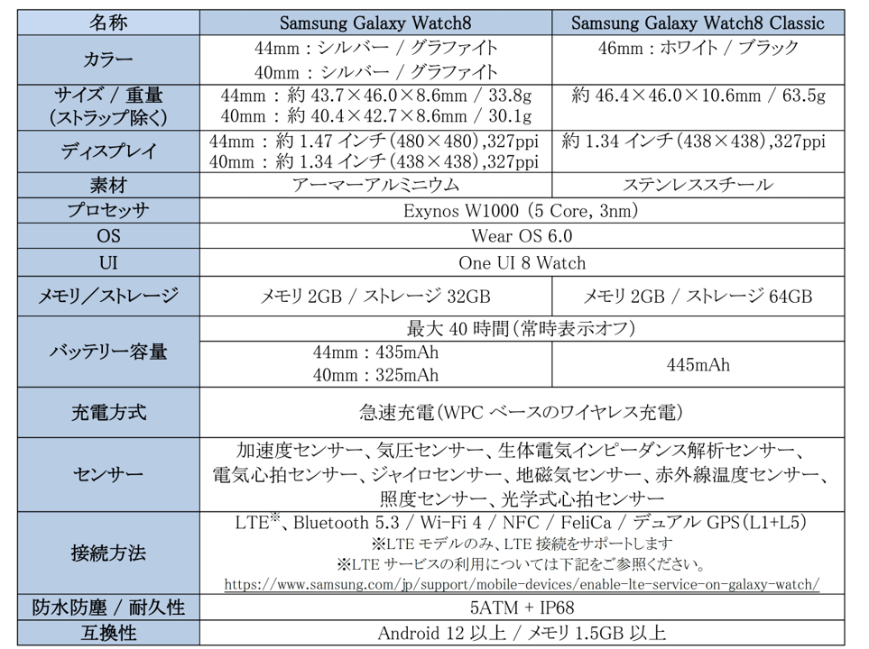 <主な仕様 :「Samsung Galaxy Watch8│Watch8 Classic」>