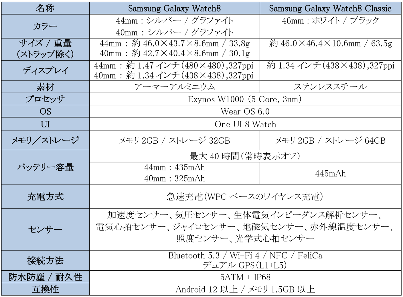 <主な仕様 :「Samsung Galaxy Watch8│Watch8 Classic」>