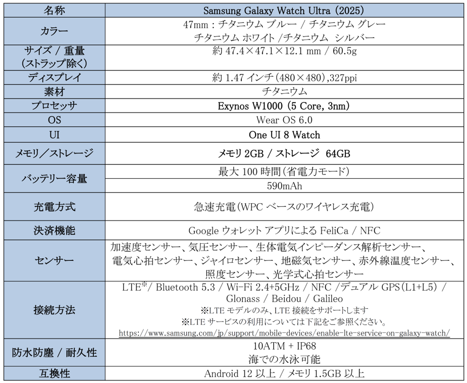 <主な仕様 : 「Samsung Galaxy Watch Ultra (2025)」>