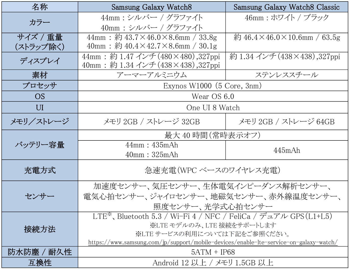 <主な仕様 :「Samsung Galaxy Watch8│Watch8 Classic」>