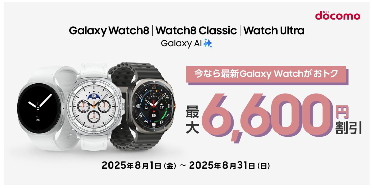 サムスン電子ジャパン株式会社は、シリーズ史上最も薄く、最も快適な着け心地を実現し、24時間の健康管理を本格サポートする最新AIスマートウォッチ「Samsung Galaxy Watch8|Watch8 Classic」、 「Samsung Galaxy Watch Ultra (2025)」を、本日2025年8月1日(金)より、全国のドコモショップ、ドコモ取扱店、ドコモオンラインショップにて販売を開始いたします