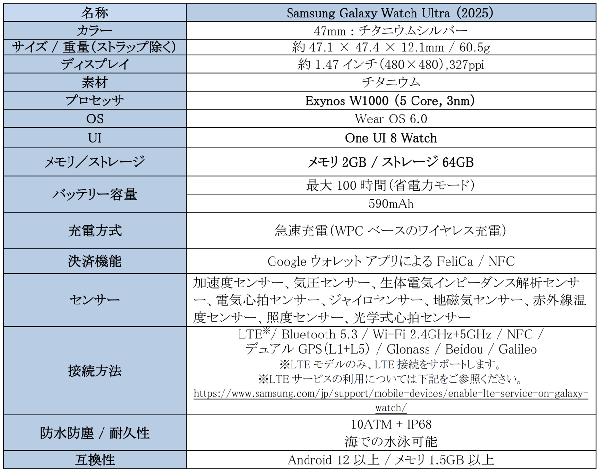 <主な仕様 : 「Samsung Galaxy Watch Ultra (2025)」>