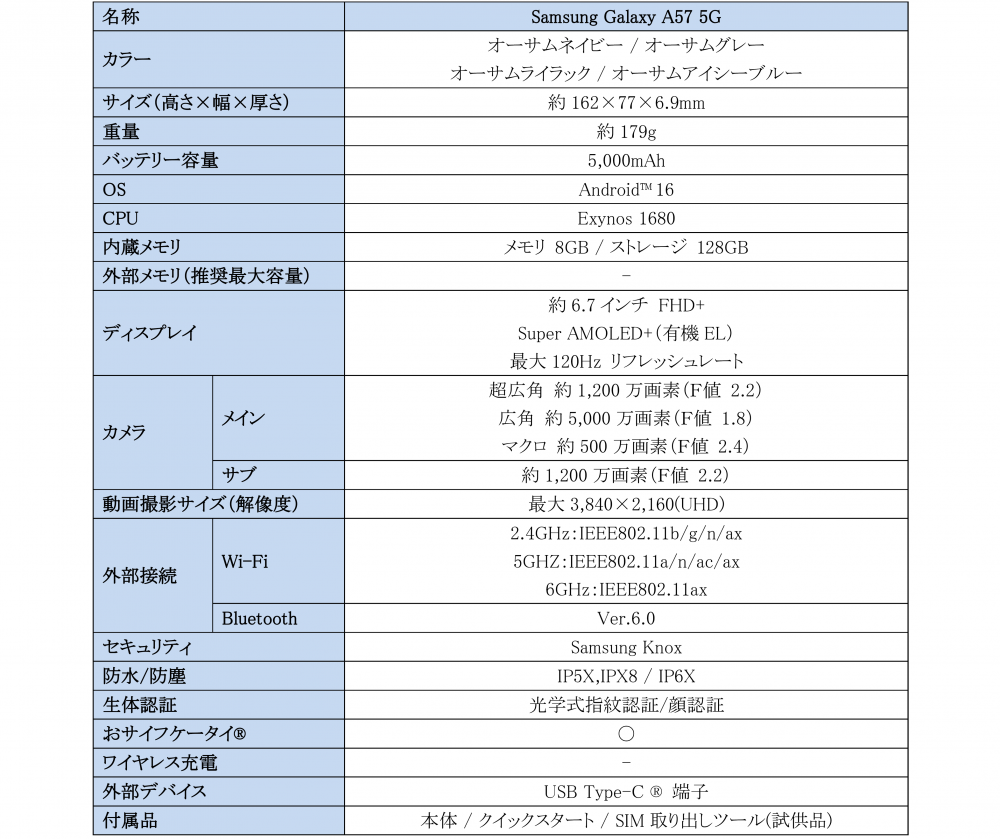 <主な仕様:「Samsung Galaxy A57 5G」>
