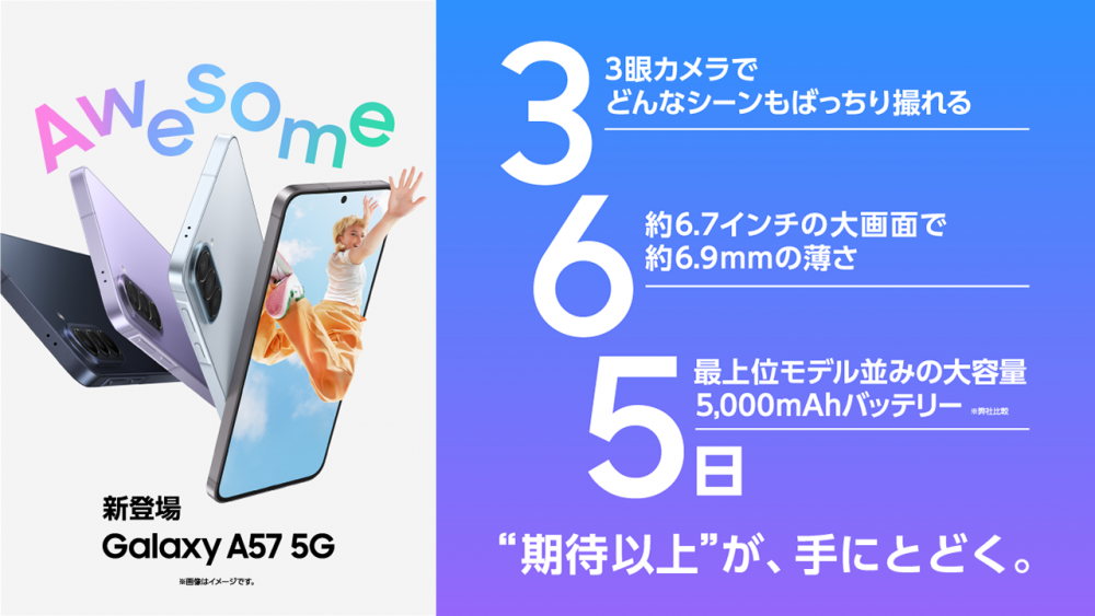 サムスン電子ジャパン株式会社は、大画面なのに薄くて軽いデザインと長時間バッテリー、進化したAwesome Intelligence※1を搭載したSamsung Galaxy Aシリーズの最新スマートフォン「Samsung Galaxy A57 5G」(SIMフリーモデル)をAmazon(アマゾンジャパン合同会社)、家電量販店(エディオン・Joshin・ビックカメラ・ヤマダデンキ・ヨドバシカメラのECサイトおよび一部店舗)、Samsung公式ストア楽天市場店、Samsung公式ストアYahoo!ショッピング店にて本日2026年4月16日(木)より予約受付を開始し、2026年4月23日(木)より販売を開始いたします。また、IIJmio(アイアイジェイミオ) にて2026年5月26日(火)より販売を開始いたします。