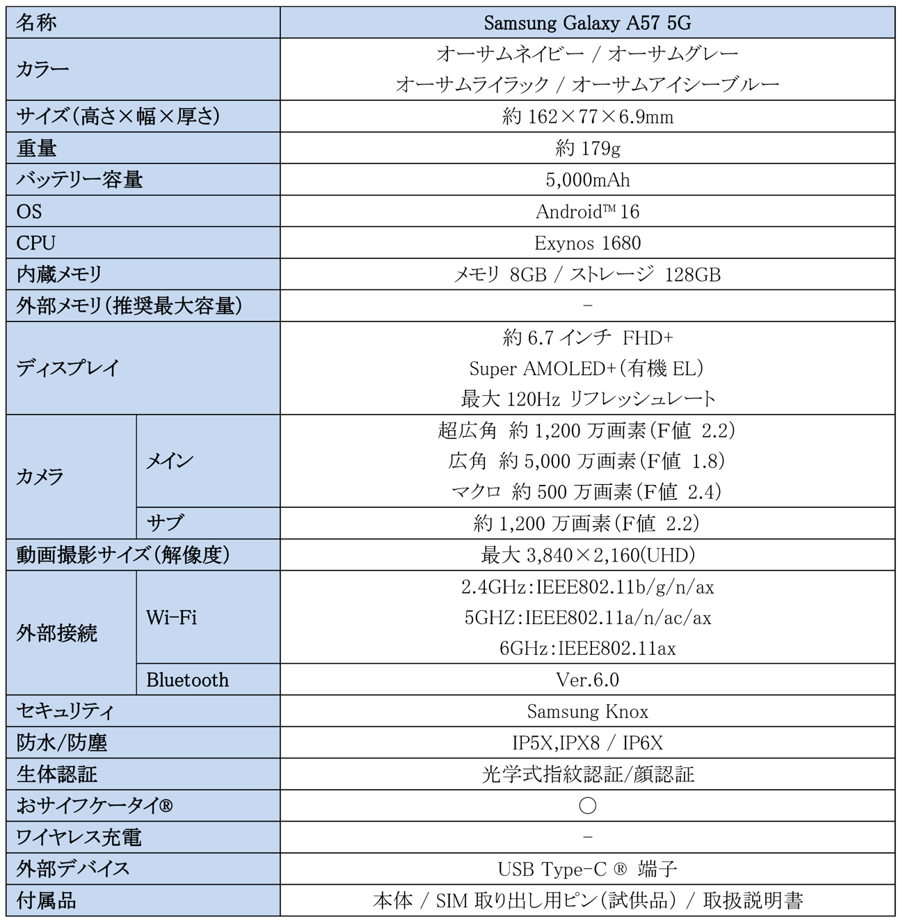 <主な仕様:「Samsung Galaxy A57 5G」>