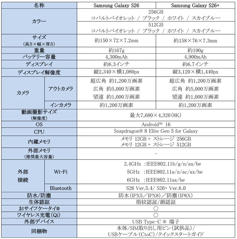 <主な仕様:「Samsung Galaxy S26」、「Samsung Galaxy S26+」>