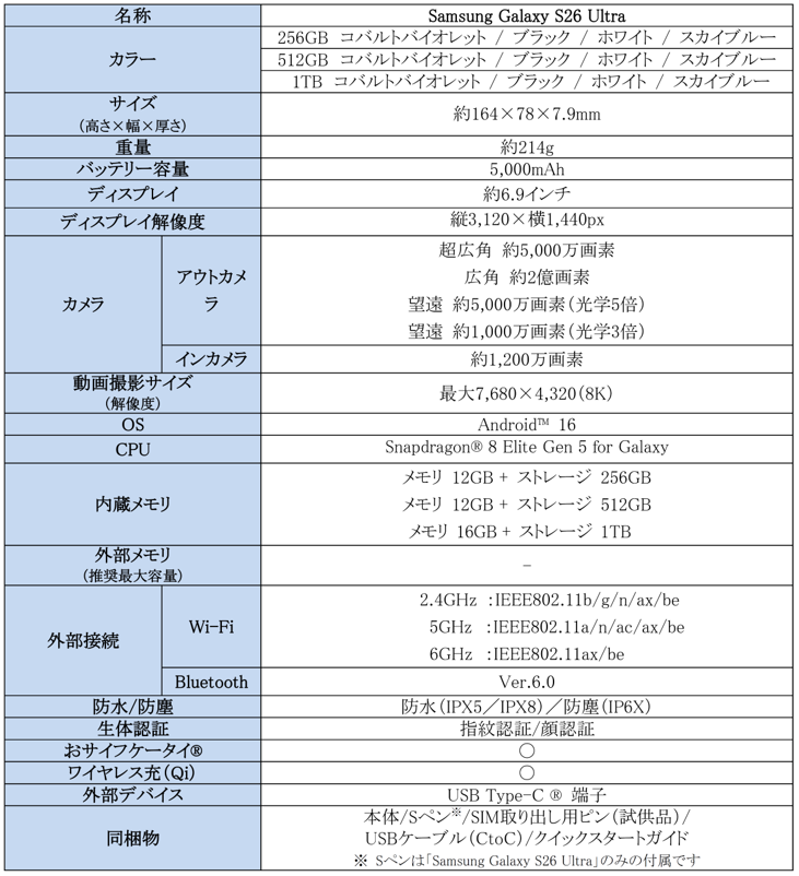 <主な仕様:「Samsung Galaxy S26 Ultra」>