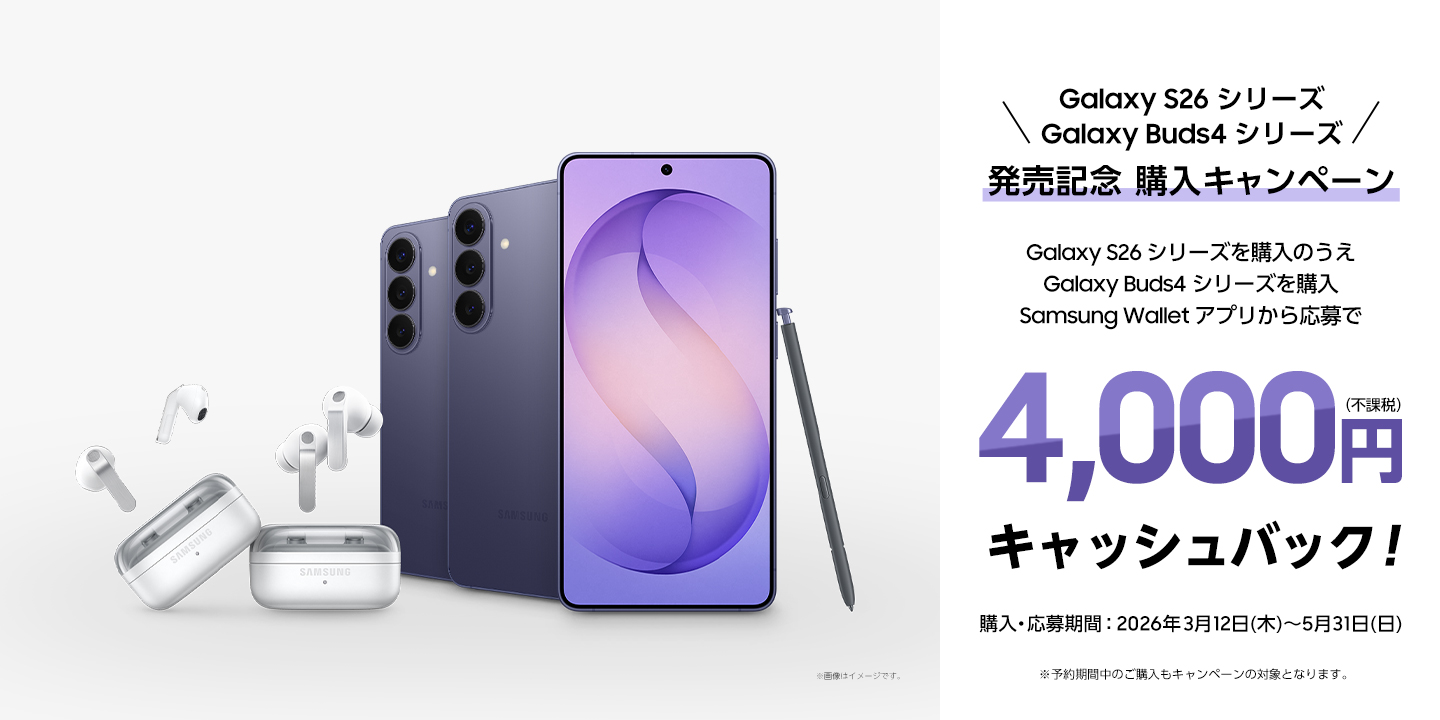 Amazon(アマゾンジャパン合同会社)、家電量販店、Samsung公式ストア楽天市場店、Samsung公式ストアYahoo!ショッピング店、IIJmio(アイアイジェイミオ)サプライサービスにて、「Samsung Galaxy S26シリーズ」と「Samsung Galaxy Buds4 シリーズ」を両方ともご購入いただき、Samsung Walletアプリから応募いただきますと4,000円(不課税)をキャッシュバックいたします。
