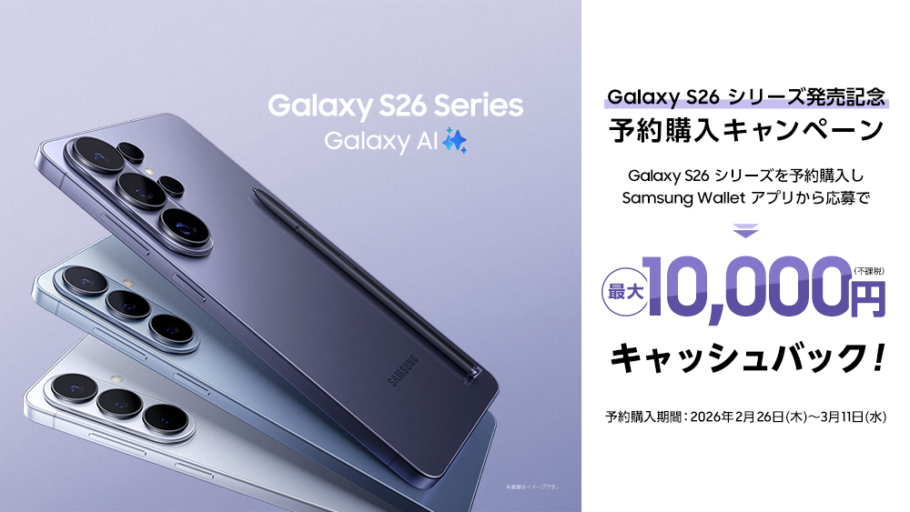 対象期間中にAmazon(アマゾンジャパン合同会社)、家電量販店、Samsung公式ストア楽天市場店、Samsung公式ストアYahoo!ショッピング店で「Samsung Galaxy S26」「Samsung Galaxy S26+」「Samsung Galaxy S26 Ultra」(SIMフリーモデル)を予約購入いただき、Samsung Walletアプリからご応募いただきますと、最大10,000円(不課税)をキャッシュバックいたします。