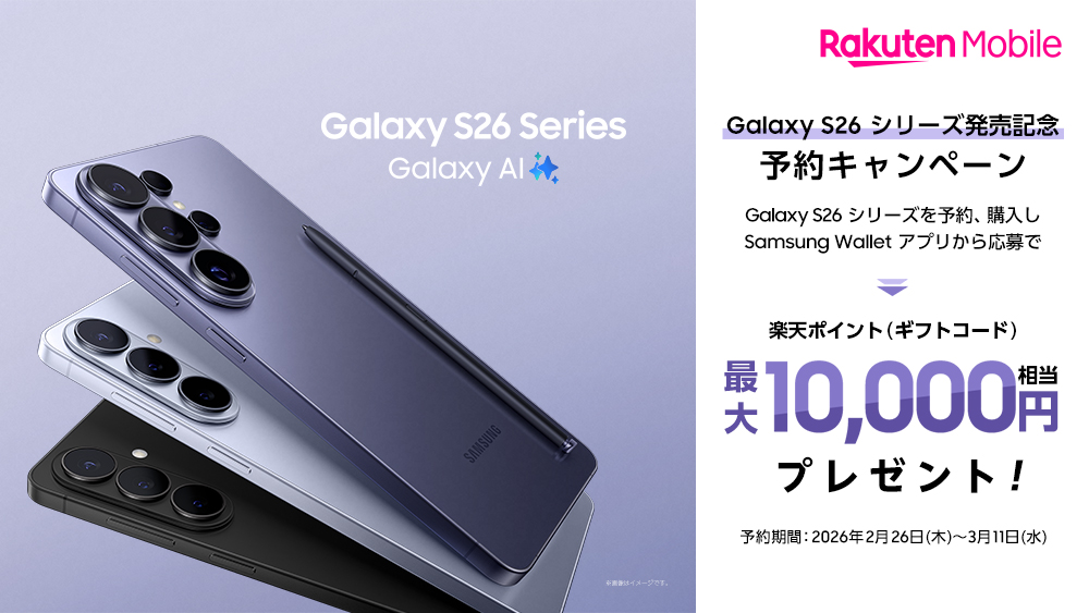 対象期間中に楽天モバイル公式サイト、楽天モバイル公式 楽天市場店にて「Samsung Galaxy S26」、「Samsung Galaxy S26+」、「Samsung Galaxy S26 Ultra」を予約購入いただき、Samsung Walletアプリからご応募いただくと楽天ポイント(ギフトコード)をプレゼントいたします。