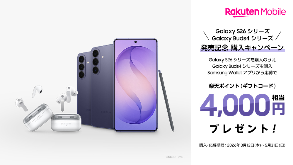 対象期間中に楽天モバイル公式サイト、楽天モバイル公式 楽天市場店、楽天モバイルショップにて「Samsung Galaxy S26シリーズ」と「Samsung Galaxy Buds4シリーズ」を両方ともご購入いただき、Samsung Walletアプリから応募いただきますと楽天ポイント(ギフトコード)をプレゼントいたします。