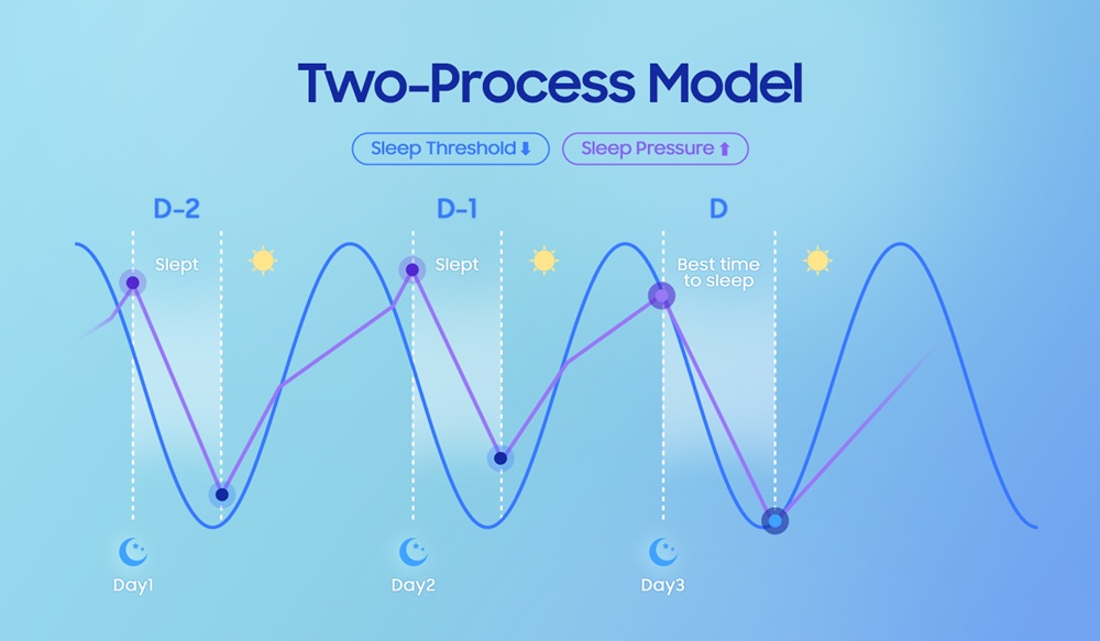 - 就寝時刻のガイダンス:睡眠調節の二過程モデルに基づく科学的アプローチを活用し、「Samsung Galaxy Watch8シリーズ」は3日間にわたり、体内時計(概日リズム)と睡眠圧(身体が必要とする睡眠量)を追跡します。収集したデータは微分方程式として解析され、すっきり目覚めるための最適な就寝時刻を算出できます。アルゴリズムは1日の睡眠基準値の変化や個人の睡眠ニーズを考慮し、パーソナライズされたアドバイスを提供します。本機能はKAISTで開発され、Samsung医療センターで臨床試験され、深く途切れない睡眠と爽快な朝を実現する、より健康的な睡眠習慣の構築をサポートします。