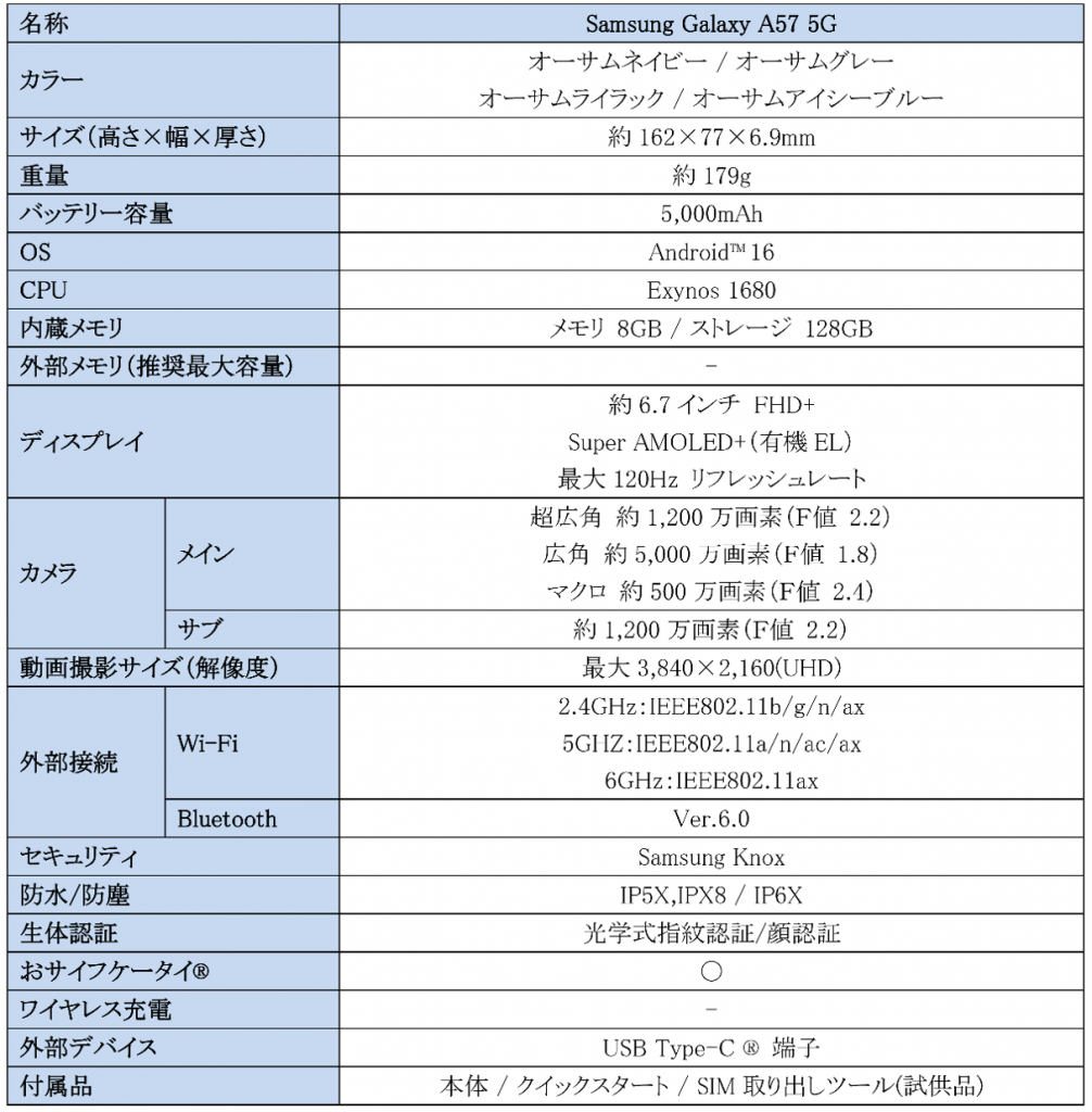 <主な仕様:「Samsung Galaxy A57 5G」>