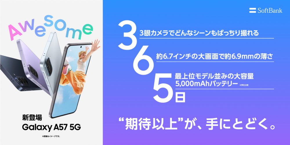 サムスン電子ジャパン株式会社は、大画面なのに薄くて軽いデザインと長時間バッテリー、進化したAwesome Intelligence※1を搭載したSamsung Galaxy Aシリーズの最新スマートフォン「Samsung Galaxy A57 5G」を全国のソフトバンクショップ、ソフトバンク取扱店、ソフトバンクオンラインショップにて、本日2026年4月23日(木)より販売を開始いたします。