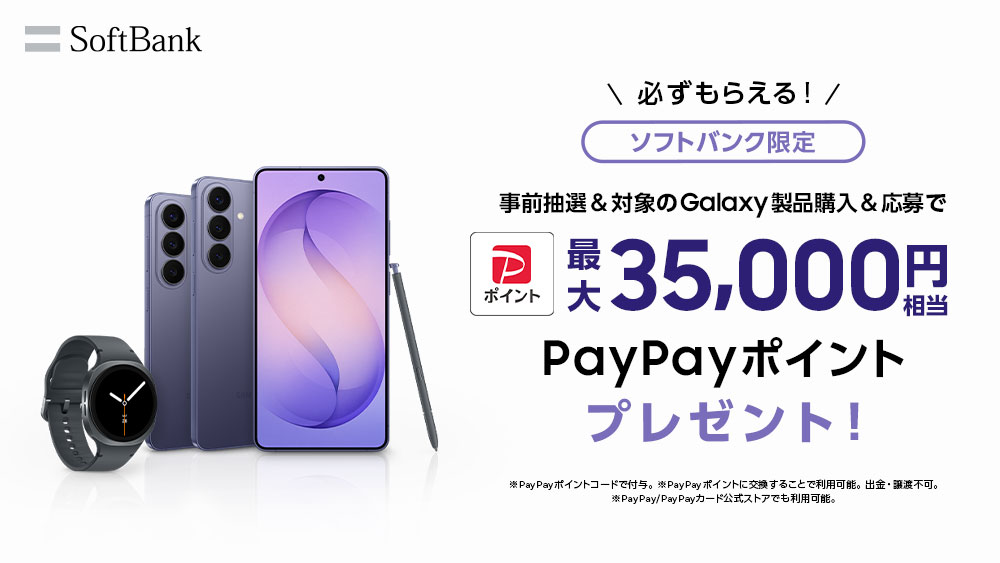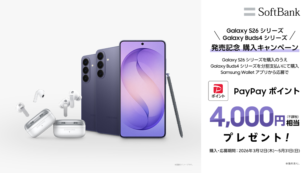 ご購入前にキャンペーンサイトで抽選に参加いただき、対象期間(終了日未定)内に全国のソフトバンクショップ、ソフトバンク取扱店、ソフトバンクオンラインショップで「Samsung Galaxy S26シリーズ」を購入の上、キャンペーンサイトでご応募いただくと最大35,000円相当のPayPayポイント※がもらえる「Samsung Galaxy対象製品をご購入でPayPayポイントがもらえるキャンペーン」を開催いたします。詳細は下記キャンペーンページをご確認ください。