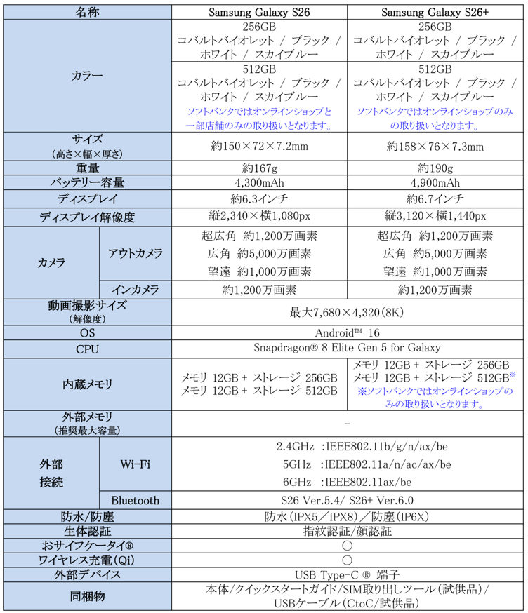 <主な仕様:「Samsung Galaxy S26」、「Samsung Galaxy S26+」>