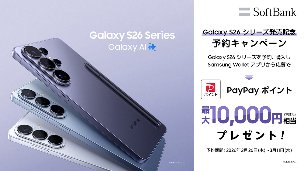 サムスン電子ジャパン株式会社(以下、サムスン)は本日、パワフルなハードウェアと業界をリードするカメラ性能、進化した直感的なGalaxy AI※が日常をかつてないほど快適で簡単にしてくれる先回りするAIフォン「Samsung Galaxy S26」、「Samsung Galaxy S26+」、「Samsung Galaxy S26 Ultra」(以下、「Samsung Galaxy S26シリーズ」)をソフトバンク株式会社(以下、ソフトバンク)で発売を決定いたしましたのでお知らせいたします。「Samsung Galaxy S26シリーズ」は、全国のソフトバンクショップ、ソフトバンク取扱店、ソフトバンクオンラインショップにて2026年2月26日(木)より予約受付を開始し、2026年3月12日(木)より販売を開始いたします。また、SB C&S株式会社から純正・専用アクセサリーも2026年3月12日(木)より販売を開始いたします。
