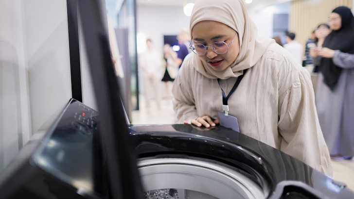 ▲ 인도 구르가온에서 열린 삼성전자 서남아 테크 세미나에서 참석자가 일체형 세탁건조기 ‘비스포크 AI 콤보’를 살펴보고 있다.
