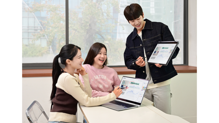 갤럭시 북5 Pro 360의 360도로 회전하는 화면은 회의실에서 팀워크 향상을 돕는다. 화면을 180도, 210도 등 자유롭게 조절해 다른 방향으로 앉아 있는 팀원과도 자료를 수월하게 공유하며 소통이 가능하다.