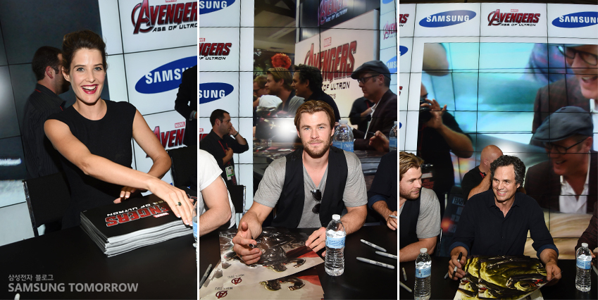 마블 부스에서도 ‘어벤저스: 에이지 오브 울트론’ 출연 영화배우 11명이 팬 사인회를 열었는데요. 팬들만큼 배우들도 신난 모습입니다.