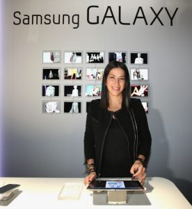 ▲2014년 F/W 뉴욕 패션위크에서 새로운 콜렉션을 선보인 디자이너 레베카 밍코프가 백스테이지에서 갤럭시 노트 프로를 들고 포즈를 취한 모습.