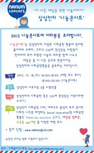 지난해에 시작한 '나눔콘서트'는 한 해 동안 사회공헌활동에 참여한 삼성전자 임직원, 수혜 학생과 교사, NGO, CSV(Create Shared Value, 공유가치창출)에 관심있는 사람들이 한자리에 모여 삼성전자의 다양한 사회공헌활동 내용과 결과를 공유하는 자리이다.