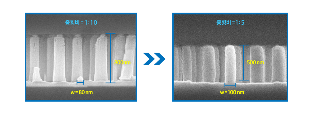 이 방식은 위상 지연이 나노 구조체의 폭과 길이에 비례한다는 점을 이용해 종횡비를 1:5 수준으로 낮출 수 있게 했다. 이를 통해 나노 기둥의 높이를 줄이면서도 기존과 동일한 광학 성능을 유지하고, 제작 난이도와 불량률을 낮추며 안정성을 높였다. 결과적으로 수율 향상과 가격 경쟁력 확보가 가능해졌다.