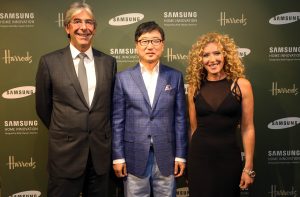 ▲ 삼성전자 CE부문 윤부근 대표(가운데), 해롯백화점 CEO 마이클 워드(좌측), 삼성전자 브랜드 전시관을 디자인한 영국 인테리어 디자이너 켈리 호펜(우측)이 함께 기념 촬영을 하고 있다.