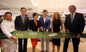 ▲ 현지시간 9월 3일 저녁 영국 런던의 해롯백화점에서 열린 '삼성전자 브랜드 전시관'오픈 행사에서 (좌로부터) 삼성 클럽드쉐프 대표 세프 미셀 트로와그로, 삼성전자 구주총괄 김석필 부사장, 삼성전자 글로벌마케팅실 심수옥 부사장, 삼성전자 CE부문 윤부근 대표, 영국 인테리어 디자이너 캘리 호펜, 해롯백화점 CEO 마이클 워드가 리본 커팅을 하고 있다.