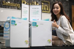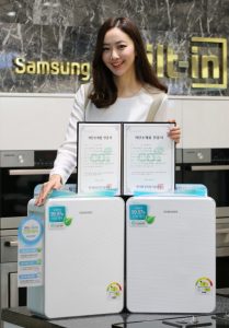 ▲삼성전자 모델이 업계 최초로 환경부 산하 한국환경산업기술원(KEITI) 으로부터 '저탄소제품' 인증을 획득한 삼성전자 공기청정기 2개 제품(AX020FCVANDD AX037FCVAUWD)을 소개하고 있다.