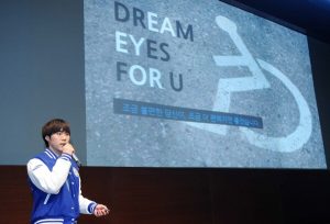 ▲삼성전자 대학생 봉사단 2기 발대식에서 휠체어 이용자의 승강기 안전사고 예방을 위해 기획한 후면 거울 설치 창의봉사 사례를 소개하고 있다. 후면 거울 설치 창의봉사는 서울도시철도공사와 협의해 7호선 온수~부평 신개통 구간 40개 승강기에 적용되기도 했다.