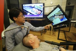 삼성전자는 25일 서울 서초사옥 투모로우 솔루션 랩(LAB) 에서 안구마우스의 차세대 버전인 ‘EYECAN+’를 시연하는 행사를 열었다.