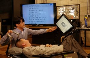▲ 25일 삼성전자 서초사옥 투모로우 솔루션 랩에서 안구마우스를 실제 사용중인 신형진씨가 직접 안구마우스 '아이캔플러스'를 시연하고 있다.
