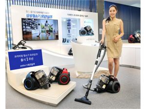 ▲ 삼성전자 모델이 17일 서울 강남구 ‘삼성 디지털프라자’ 강남본점 내 ‘모션싱크 플래그십 숍인숍’에서 출시 1년 만에 국내 프리미엄 진공 청소기 시장을 석권한 삼성 프리미엄 청소기 ‘모션싱크’를 소개하고 있다.