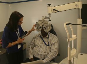 ▲'태양광 이동형 의료차' 10월 23일 (현지시간) 삼성전자가 아프리카 남아프리카공화국 요하네스버그에 위치한 갤라거 에스테이츠(Gallagher Estates) 컨퍼런스 센터에서 '삼성 디지털 빌리지' 시험 행사에서 태양광 이동형 의료차에서 전문 의료진이 안과 진료장비를 시연하고 있다.
