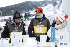 ▲ 20일 월드 스노보드 데이 2014가 진행된 강원도 평창 보광 휘닉스파크에서 프로 스노보드 선수인 최준규 선수(버튼 팀라이더, 사진 왼쪽)와 이용호 선수(아날로그 팀라이더, 사진 가운데)가 삼성전자 스마트 헤드셋 기어 서클'을 이용해 보는 모습.