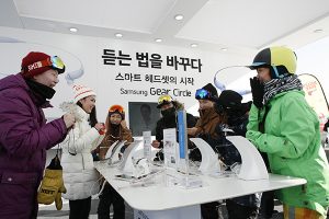 ▲ 20일 월드 스노보드 데이 2014가 진행된 강원도 평창 보광 휘닉스파크에서 스키장을 찾은 방문객들이 삼성전자 스마트 헤드셋 '기어 서클'을 체험하는 모습.