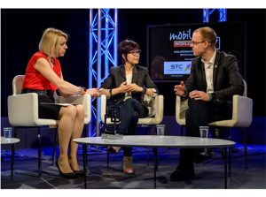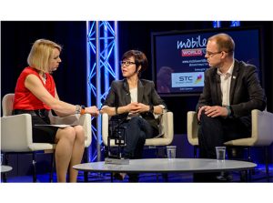 ▲ 삼성전자의 '삼성 기어 핏'이 스페인 바르셀로나에서 열린 '모바일 월드 콩그레스 2014'의 '최고 모바일 제품'으로 선정됐다. 사진은 삼성전자 무선사업부 마케팅팀장 이영희 부사장이 '최고 모바일 제품'을 수상하는 모습 사진(왼쪽부터 사샤 트위닝(Sasha Twining) 앵커, 이영희 부사장)